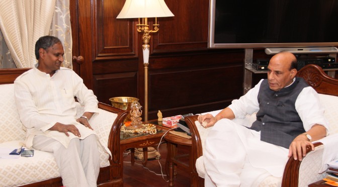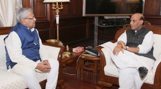 The Governor of Nagaland and Tripura, Shri Padmanabha Balakrishna Acharya calling on the Union Home Minister, Shri Rajnath Singh, in New Delhi on November 12, 2014.