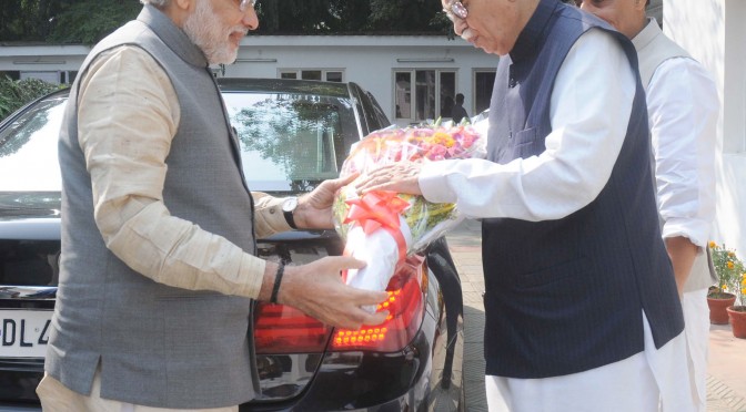 The Prime Minister, Shri Narendra Modi greeting Shri Lal Krishana Advani on his birthday, in New Delhi on November 08, 2014. The Union Home Minister, Shri Rajnath Singh is also seen.