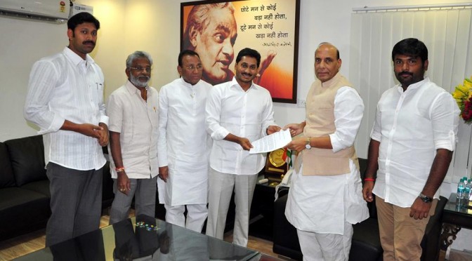 YSR congress party chief Jaganmohan Reddy,along with party MPs to Meeting Union Home Minister Rajnath Singh at his residence in new delhi. (09-11-2014)