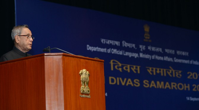राष्ट्रपति श्री प्रणब मुखर्जी 14 सितम्बर, 2014 को नई दिल्ली में हिन्दी दिवस समारोह को संबोधित करते हुए।