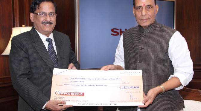 केन्द्रीय गृह मंत्री श्री राजनाथ सिंह रिपैट्रियेट्स कोपरेटिव फाइनेंस एंड डवलेपमेंट लिमिटेड (आरईपीसीओ बैंक) के प्रबंध निदेशक श्री आर. वरदराजन से 15 सितम्बर, 2014 को नई दिल्ली में वर्ष 2012-13 के लिए 15.26 करोड़ रूपये का लाभांश चेक प्राप्त करते हुए।