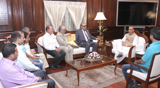 A delegation from J&K accompanied by the Chairman, Press Council of India, Justice Markandey Katju calling on the Union Home Minister, Shri Rajnath Singh, in New Delhi on September 17, 2014
