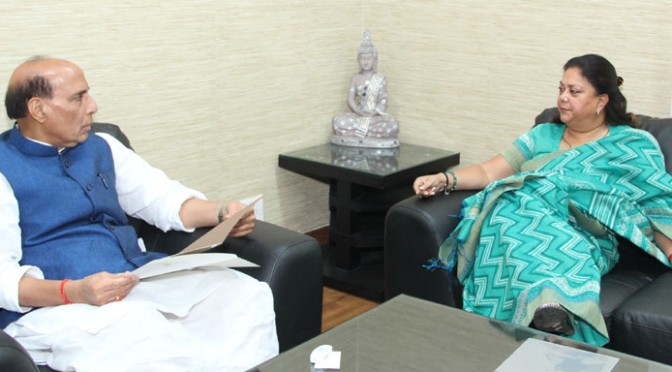 The Chief Minister of Rajasthan, Smt. Vasundhara Raje Scindia calling on the Union Home Minister, Shri Rajnath Singh, in New Delhi on April 10, 2016.