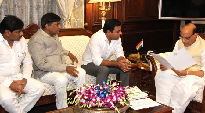 A delegation led by the Minister for Information Technology (IT), Panchayat Raj (PR) and Municipal Administration and Urban Development (MAUD), Telangana, Shri K.T. Rama Rao calling on the Union Home Minister, Shri Rajnath Singh, in New Delhi on March 29, 2016.