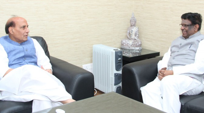 The Governor of Meghalaya, Shri V. Shanmuganathan calling on the Union Home Minister, Shri Rajnath Singh, in New Delhi on March 25, 2016.