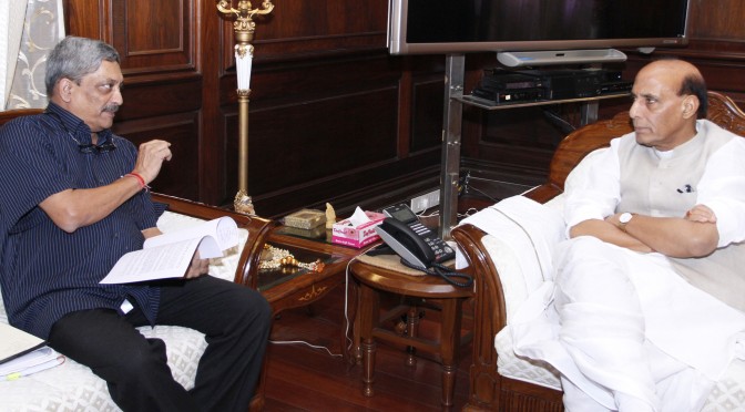 The Union Minister for Defence, Shri Manohar Parrikar calling on the Union Home Minister, Shri Rajnath Singh, in New Delhi on June 29, 2015.