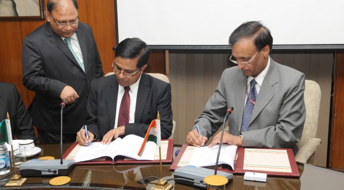 The Union Home Secretary, Shri L.C. Goyal and the Senior Secretary, Ministry of Home Affairs, Government of Bangladesh, Dr. Md. Mozammel Haque Khan signing an agreement between the Governments of India and Bangladesh after Home Secretary level talks, in New Delhi on February 19, 2015.