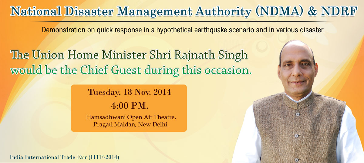 गृहमंत्री आज एनडीएमए और एनडीआरएफ द्वारा आयोजित आपदा प्रबंधन कार्यक्रम पर प्रगति मैदान प्रदर्शनी में मुख्य अतिथि होंगे। 18 Nov, 2014.