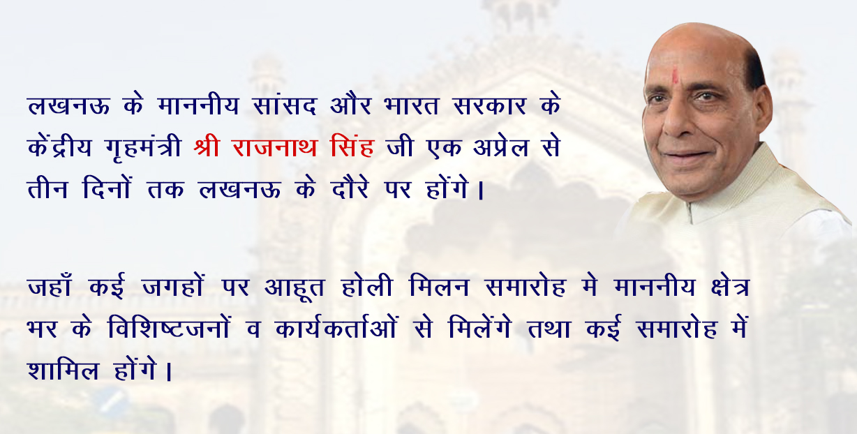 लखनऊ के माननीय सांसद और भारत सरकार के केंद्रीय गृहमंत्री श्री राजनाथ सिंह जी एक अप्रेल से तीन दिनों तक लखनऊ प्रवास पर होंगे। 30 मार्च 2016.