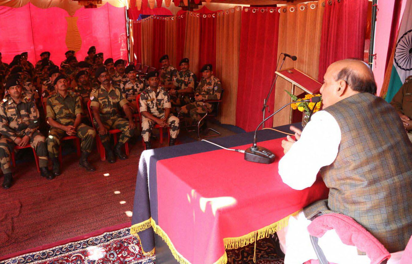 The Union Home Minister, Shri Rajnath Singh the BSF Jawans, at Karimganj, Indo-Bangladesh border, in Assam on January 03, 2016.