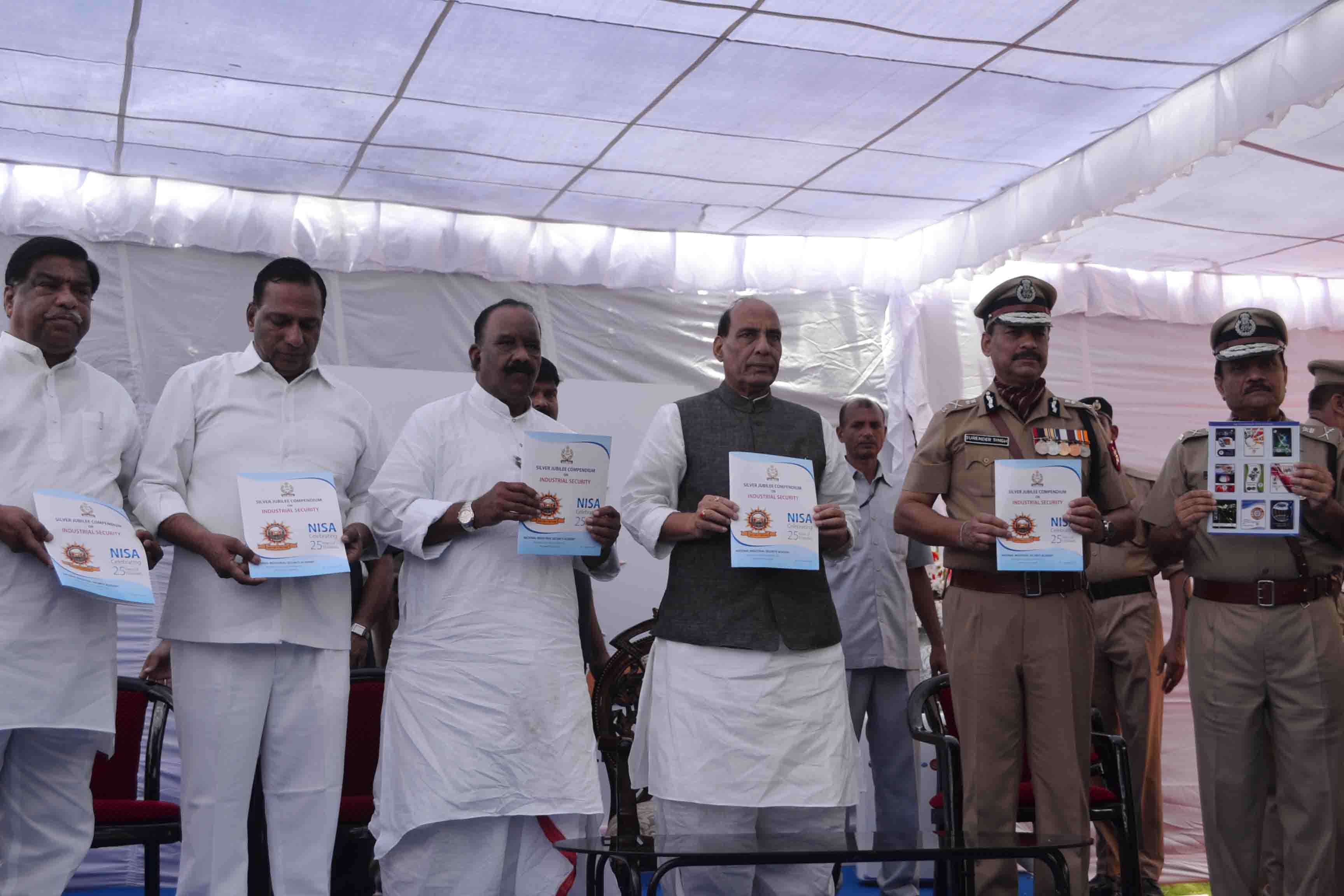 The Union Home Minister, Shri Rajnath Singh releasing the Silver Jubilee Souvenir of National Industrial Security Academy in Hyderabad on September 08, 2015. The Telangana State Home Minister Shri Nayani Narasimha Reddy, Malkajigiri Loksabha Member Shri Malla Reddy also seen