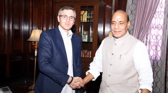 bThe Union Home Minister Shri Rajnath Singh meeting with the Chief Minister of Jammu & Kashmir Shri Omar Abdullah at North Block (New Delhi) on 20 June 2014