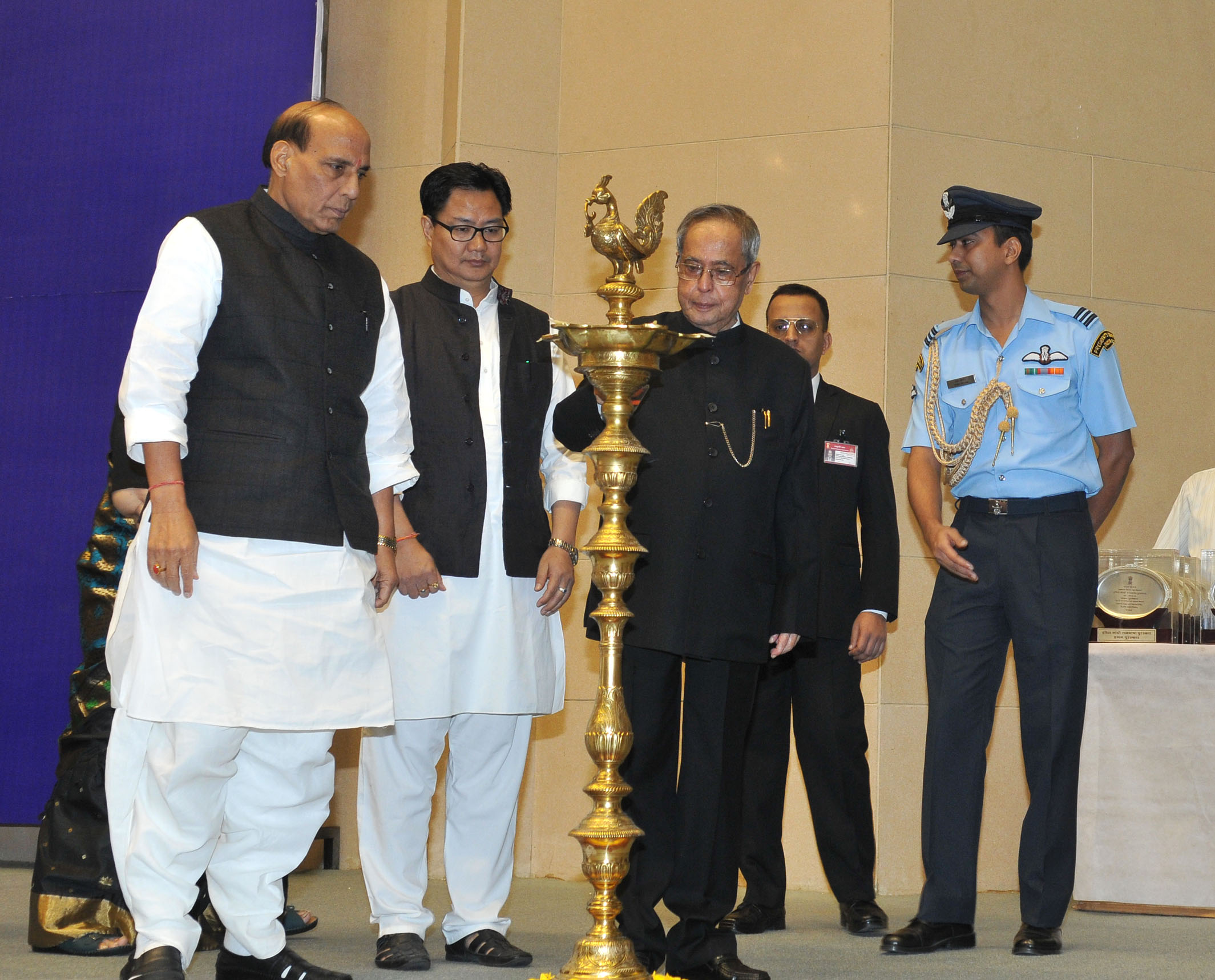 The President, Shri Pranab Mukherjee lighting the lamp at the Official Language awards presentation ceremony, at Rajbhasha Samaroh, in New Delhi on November 15, 2014. The Union Home Minister, Shri Rajnath Singh and the Minister of State for Home Affairs, Shri Kiren Rijiju are also seen.