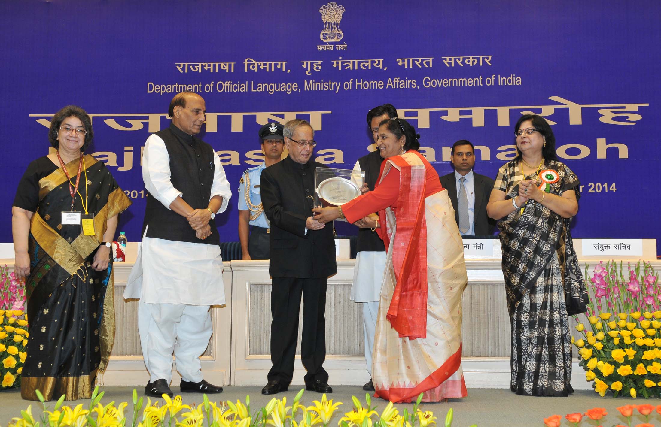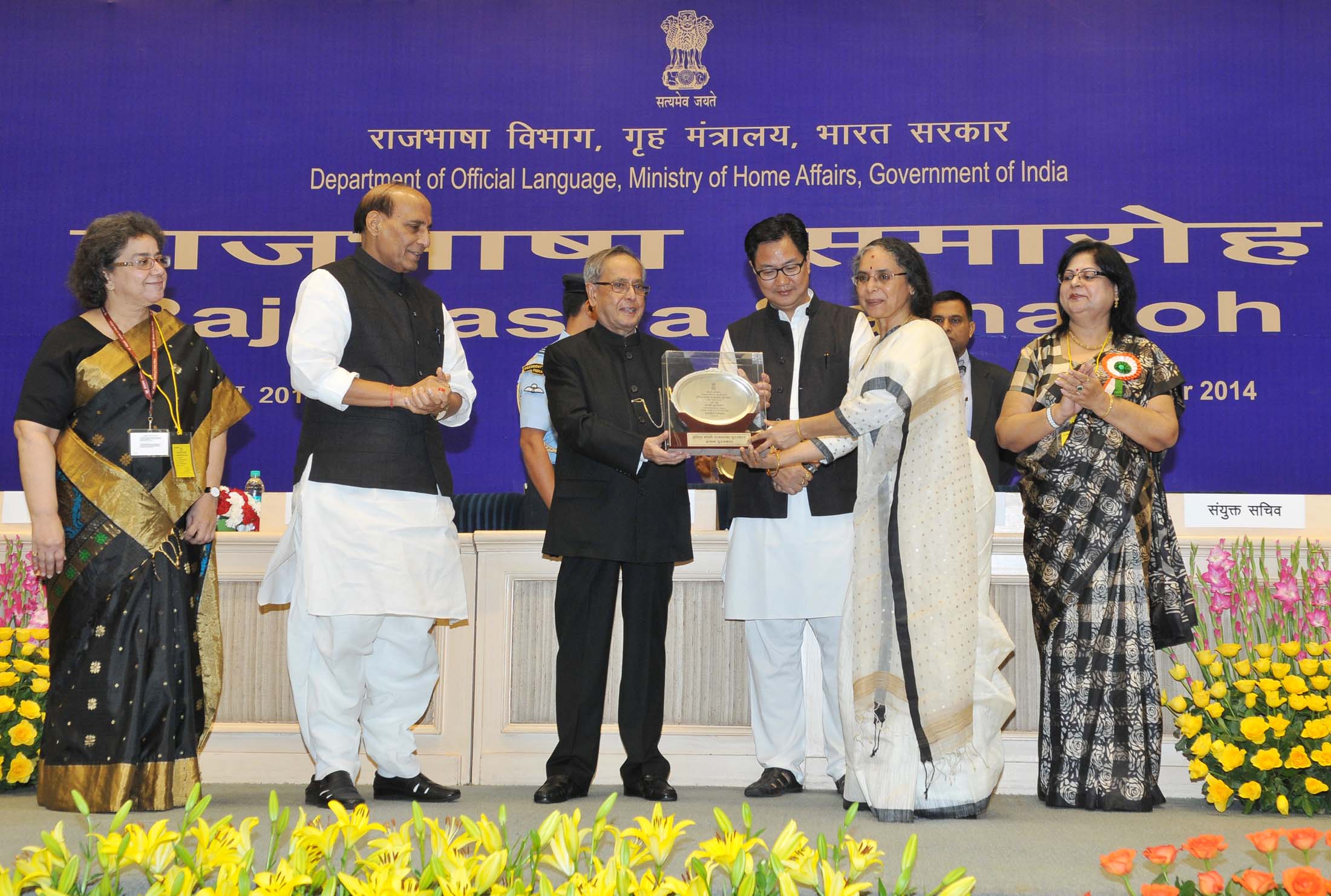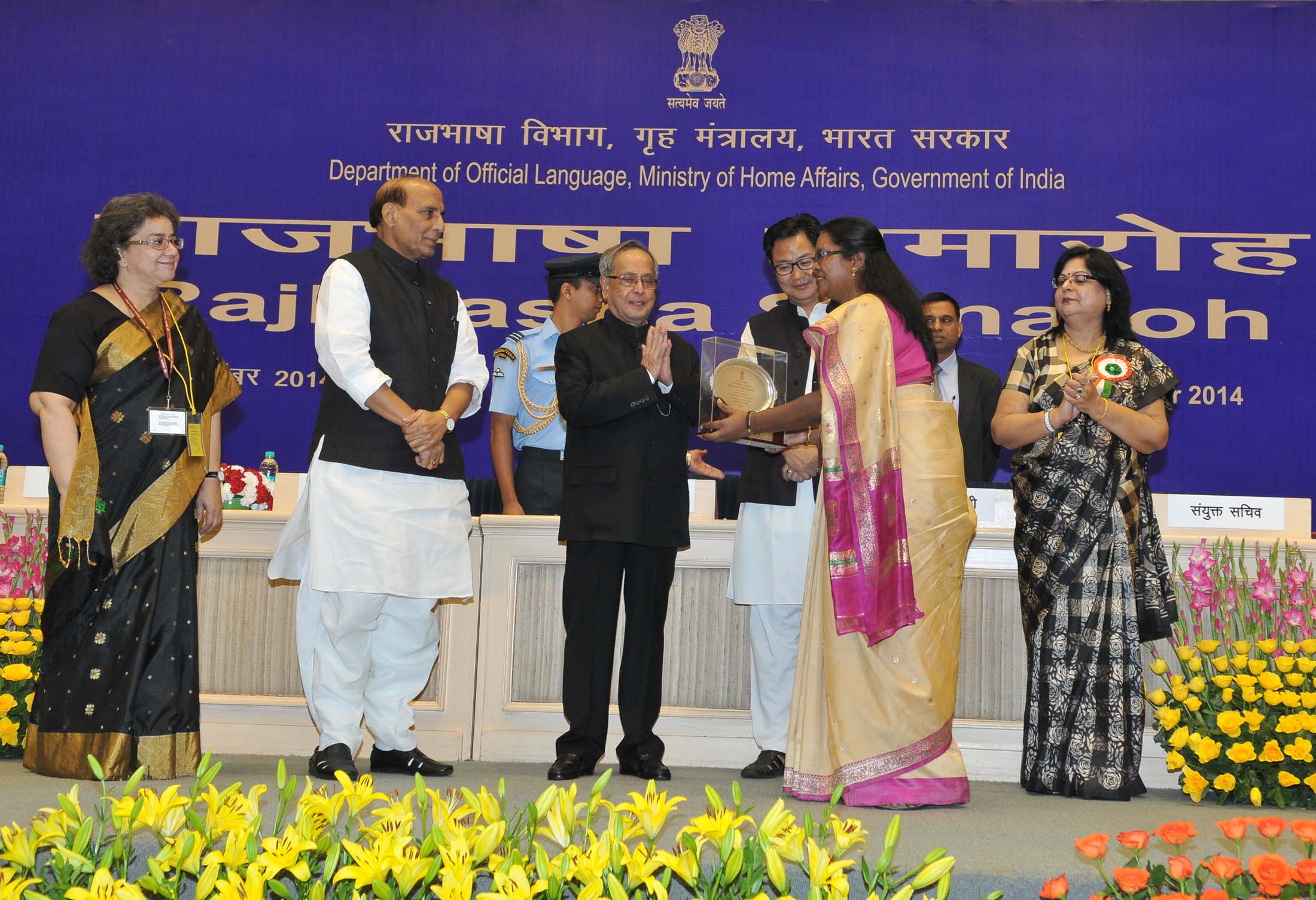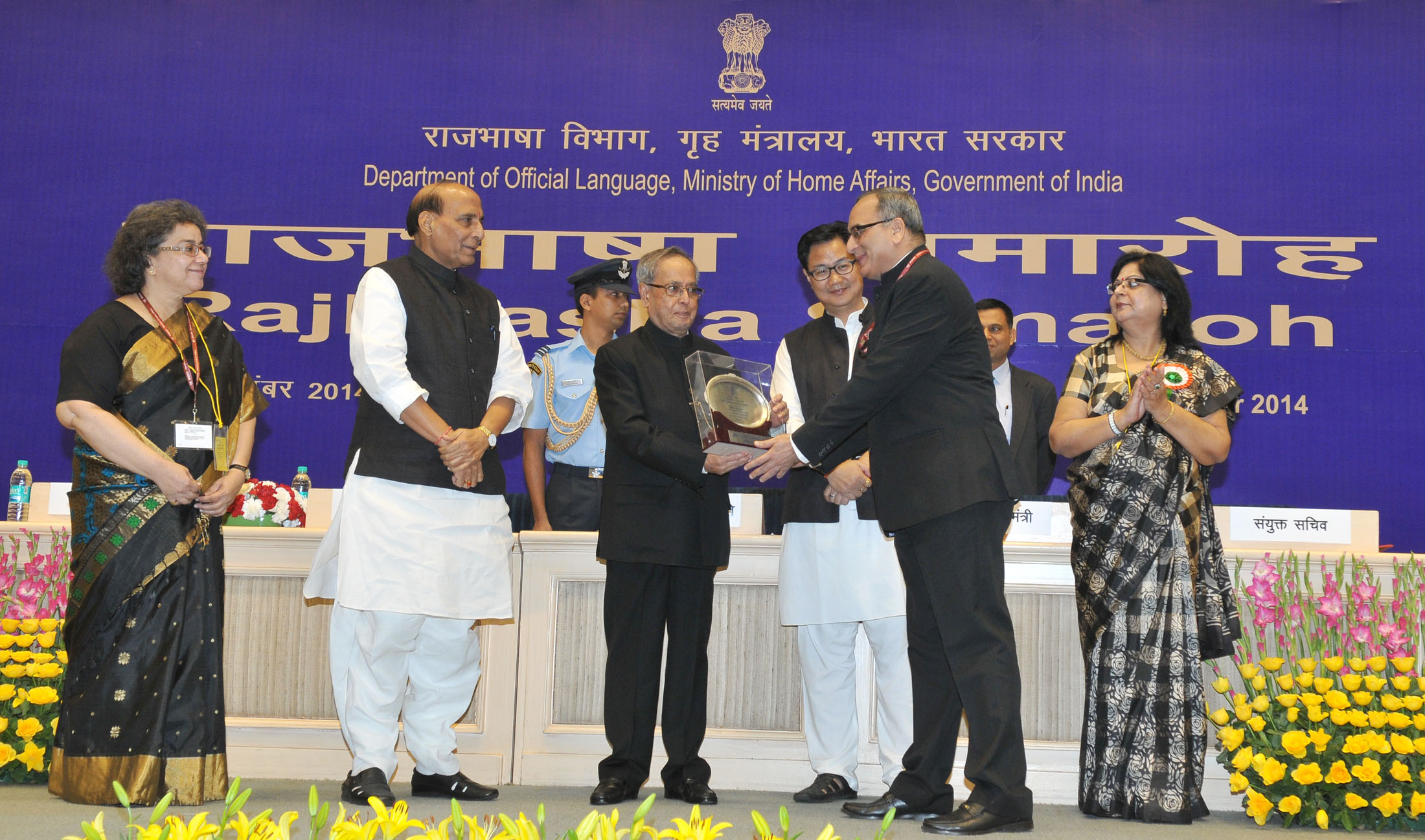 The President, Shri Pranab Mukherjee presenting the Official Language award to the Secretary, Ministry of Information and Broadcasting, Shri Bimal Julka, at Rajbhasha Samaroh, in New Delhi on November 15, 2014. The Union Home Minister, Shri Rajnath Singh, the Minister of State for Home Affairs, Shri Kiren Rijiju and the Secretary of official language, Ministry of Home Affairs, Smt. Nita Chowdhury are also seen.