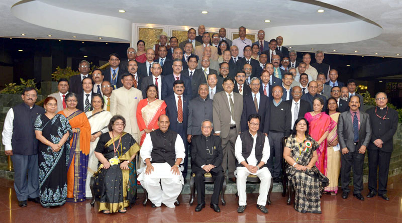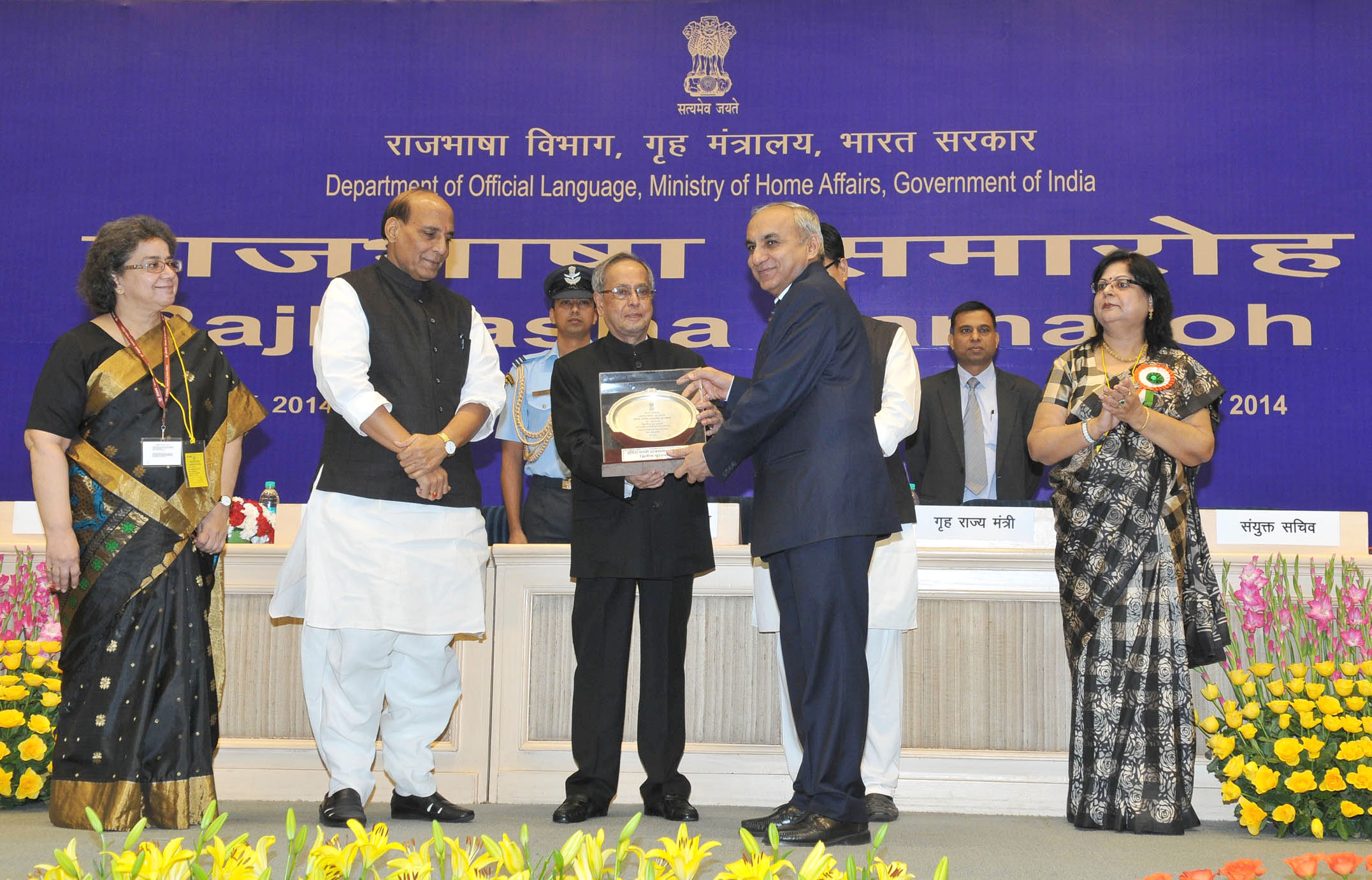 The President, Shri Pranab Mukherjee presenting the Official Language award to the Chairman, Railway Board, Shri Arunendra Kumar, at Rajbhasha Samaroh, in New Delhi on November 15, 2014. The Union Home Minister, Shri Rajnath Singh and the Secretary of official language, Ministry of Home Affairs, Smt. Nita Chowdhury are also seen.