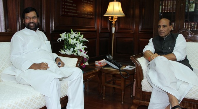 The Minister of Consumer Affairs, Food and Public Distribution, Shri Ram Vilas Paswan calls on the Union Home Minister, Shri Rajnath Singh, in New Delhi on August 04, 2014.