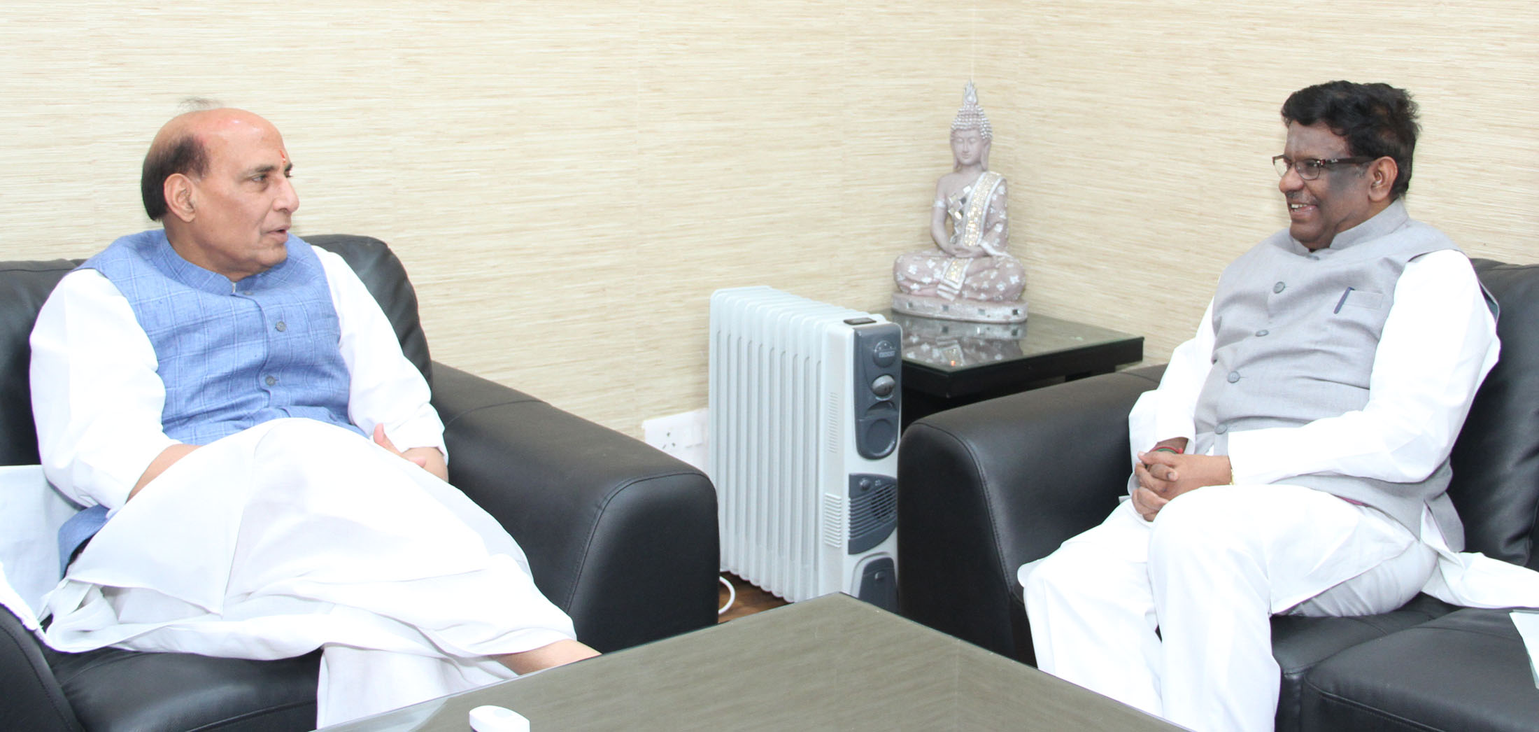 The Governor of Meghalaya, Shri V. Shanmuganathan calling on the Union Home Minister, Shri Rajnath Singh, in New Delhi on March 25, 2016.