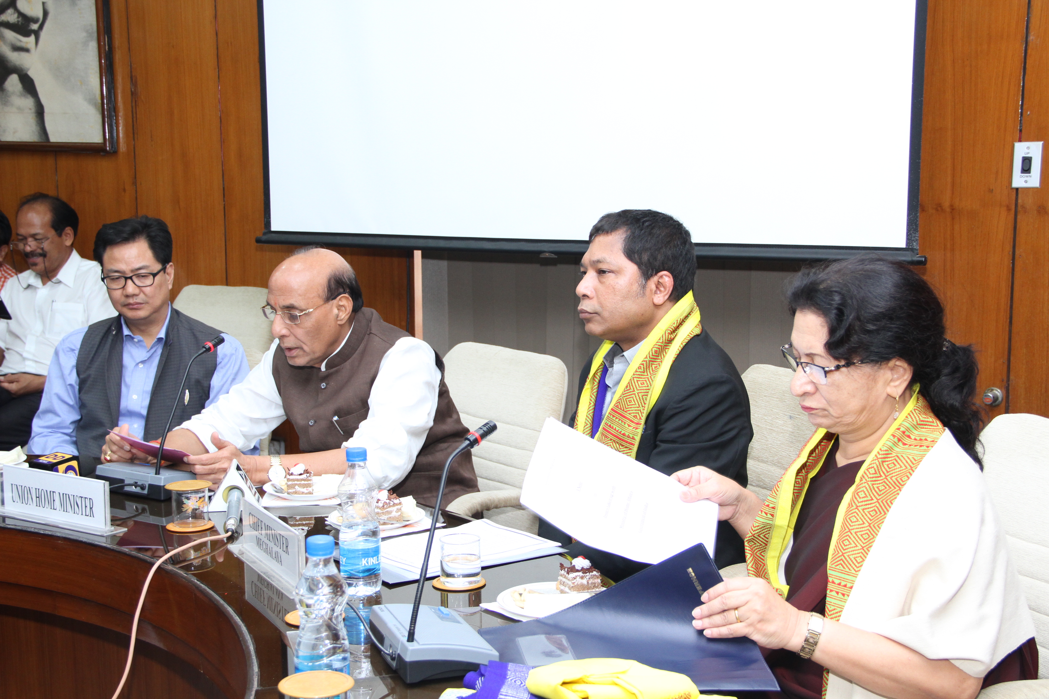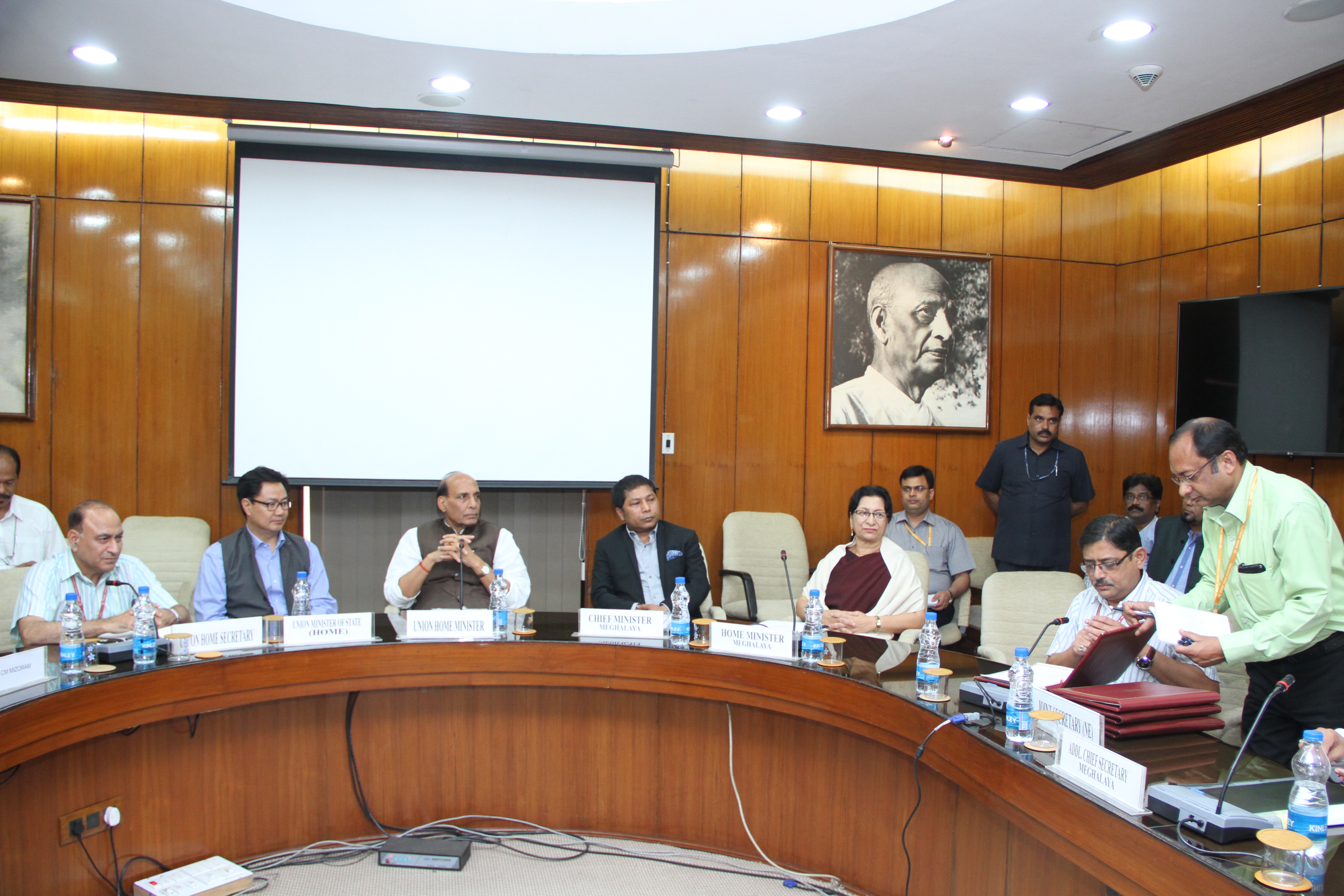 The Minister of State for Home, Shri Kiren Rijiju, the Chief Minister of Meghalaya, Dr. Mukul Sangma and the Home Minister of Meghalaya, Ms. Roshan Warjri, are also seen.