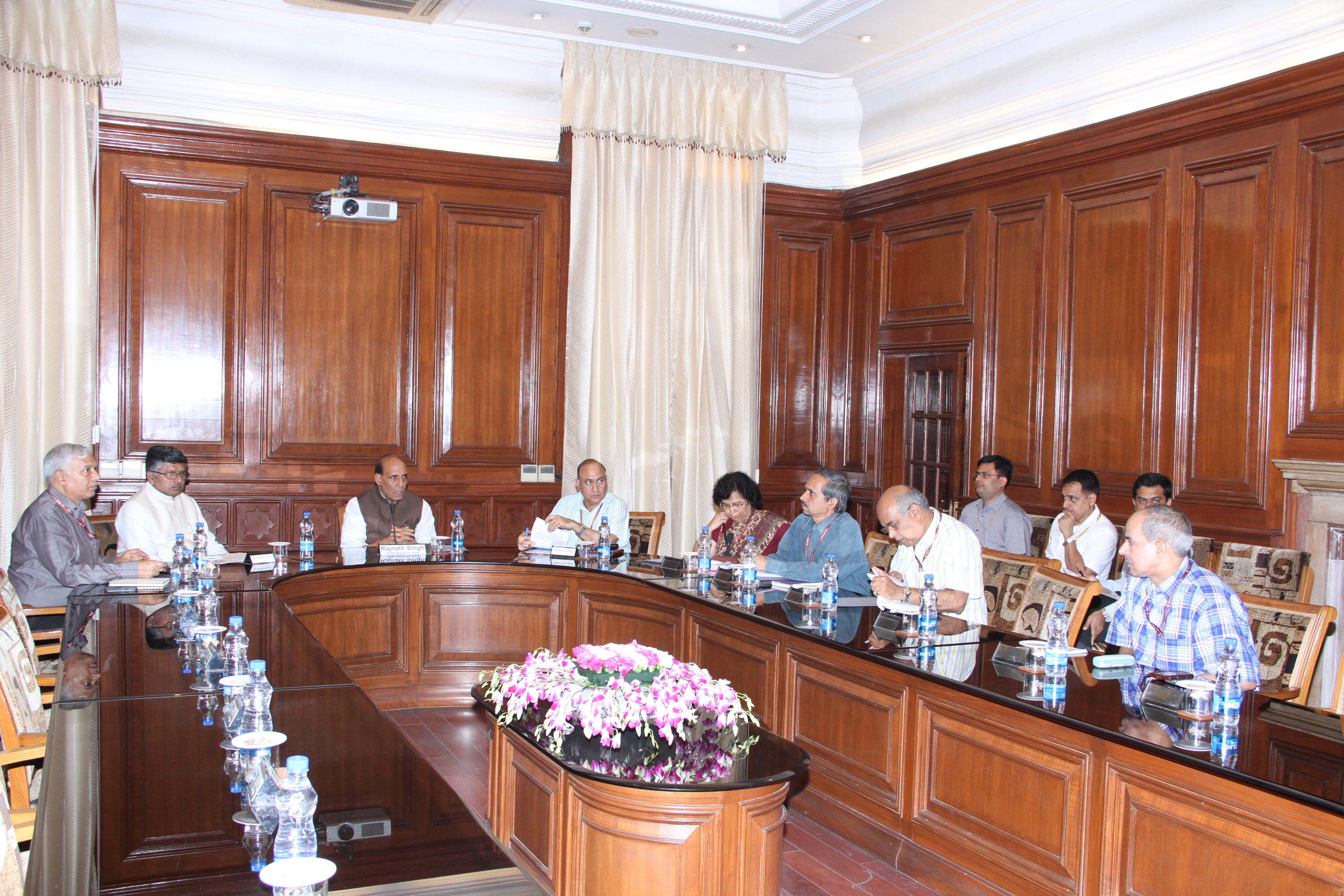 The Union Home Minister, Shri Rajnath Singh, and the Union Minister for Communications & Information Technology and Law & Justice, Shri Ravi Shankar Prasad , along with officials in a review meeting on Communication Network during Disasters, in New Delhi on September 24, 2014.