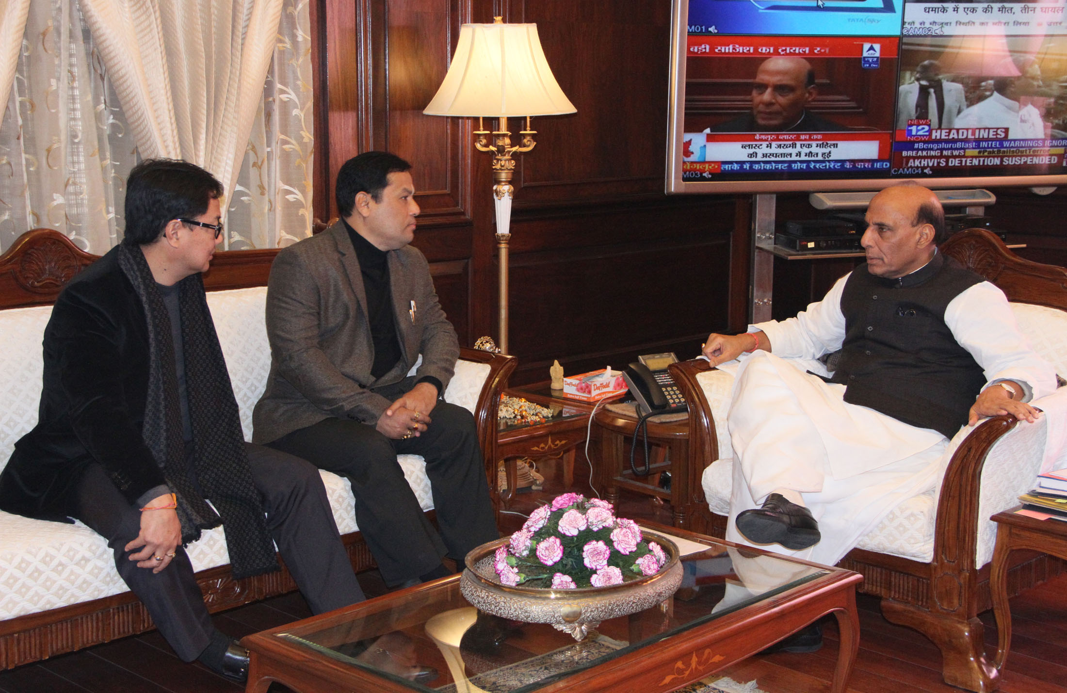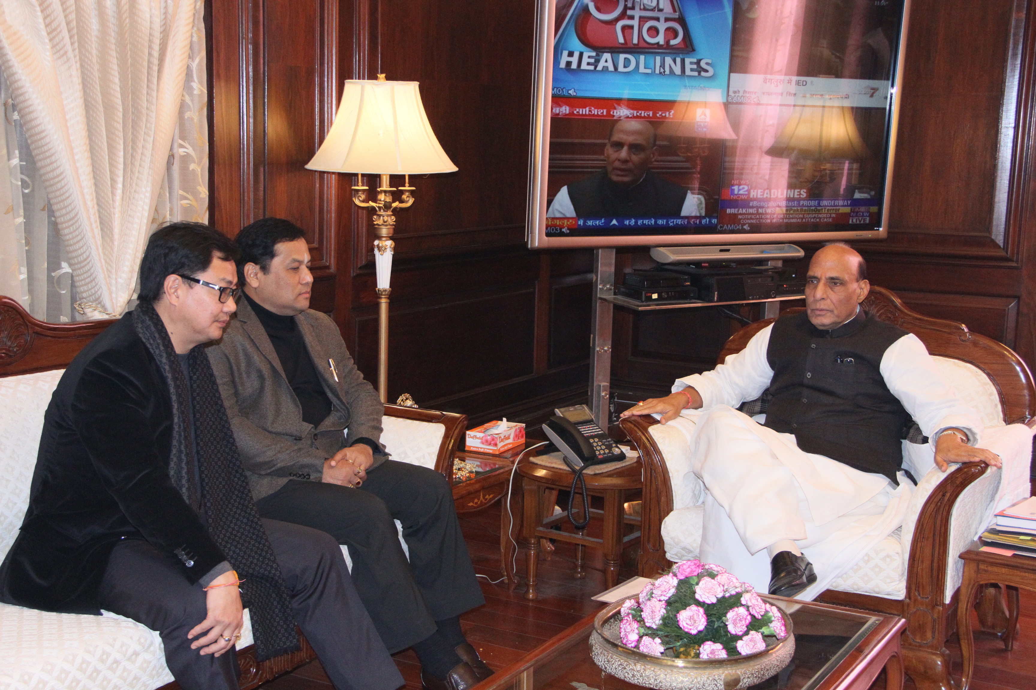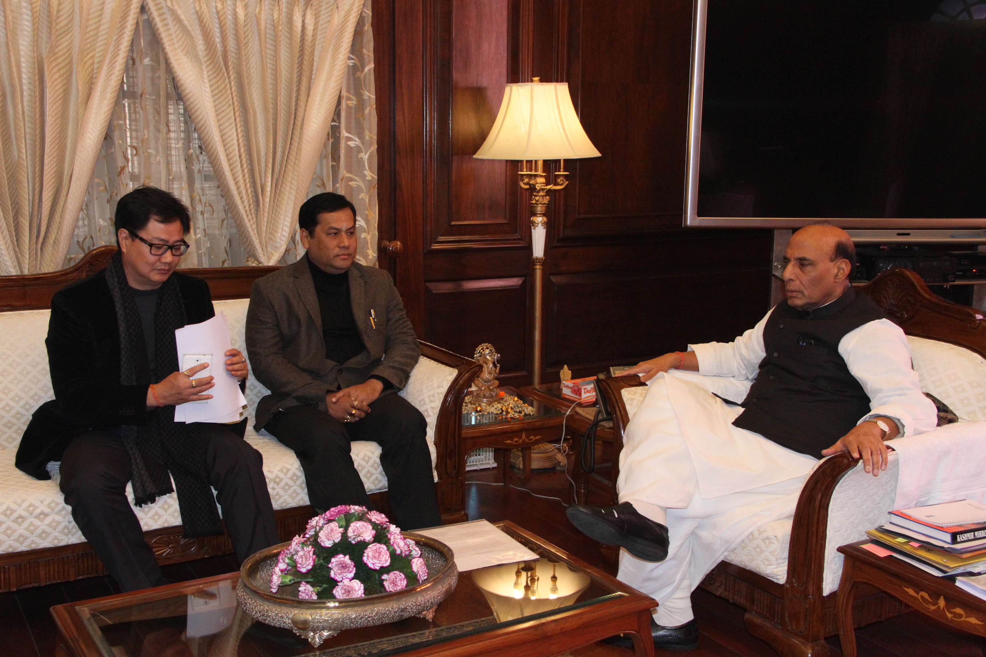 The Union Home Minister, Shri Rajnath Singh discussed the relief and rehabilitation work in the violence hit districts of Sonitpur and Kokrajhar in Assam with Minister of State for Youth Affairs and Sports (Independent Charge), Shri Sarbananda Sonowal and the Minister of State for Home Affairs, Shri Kiren Rijiju, in New Delhi on December 29, 2014.