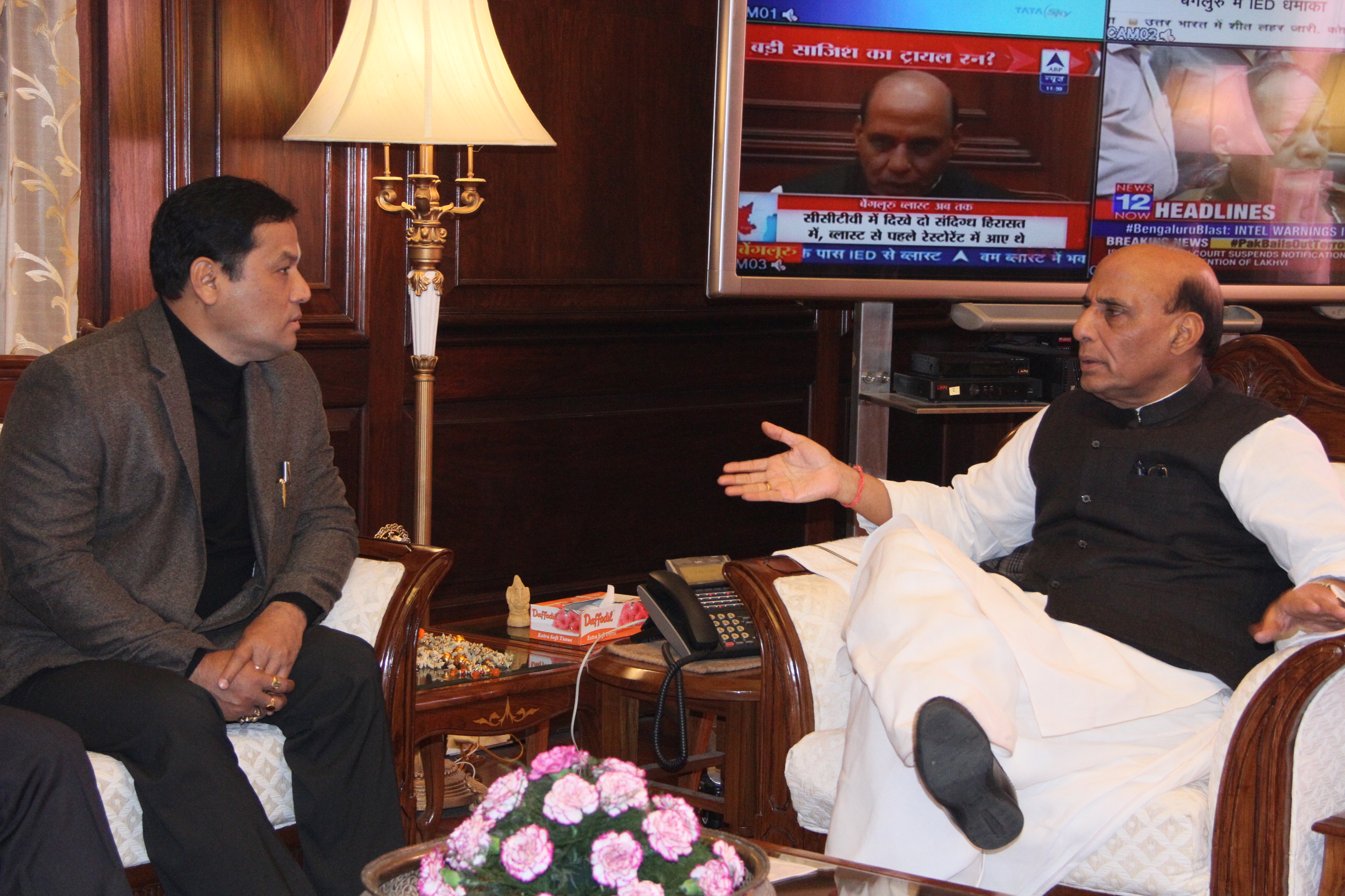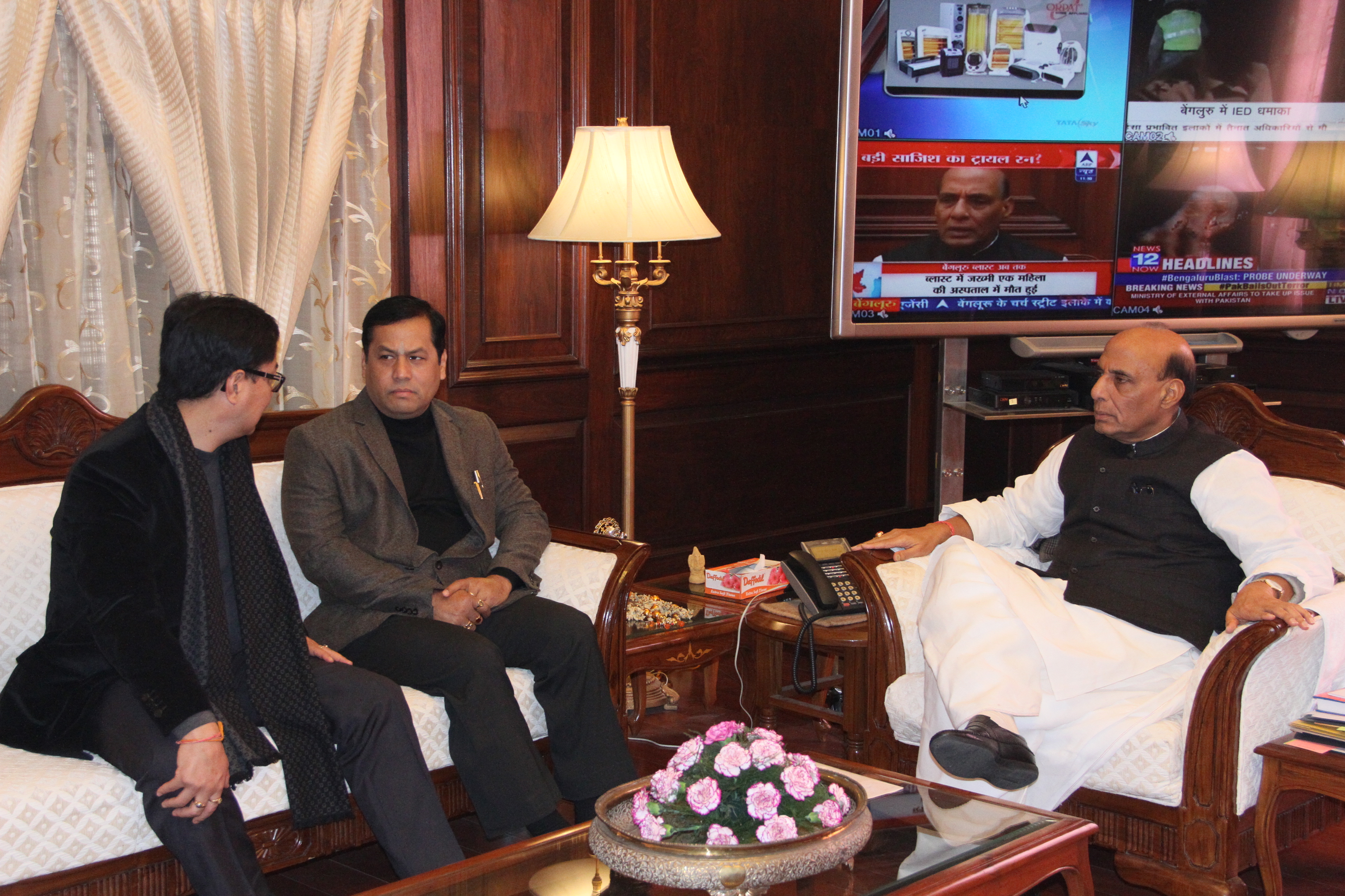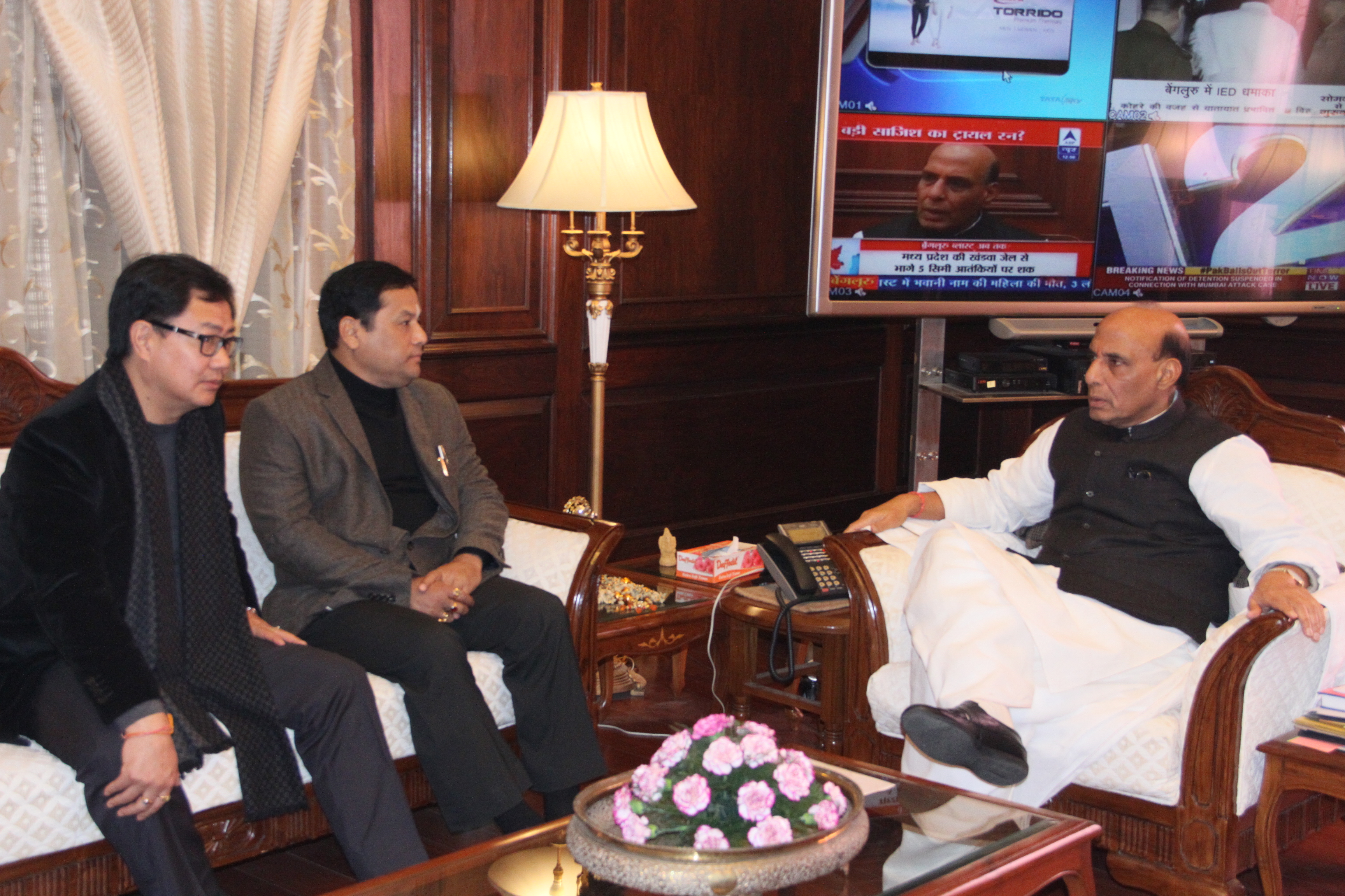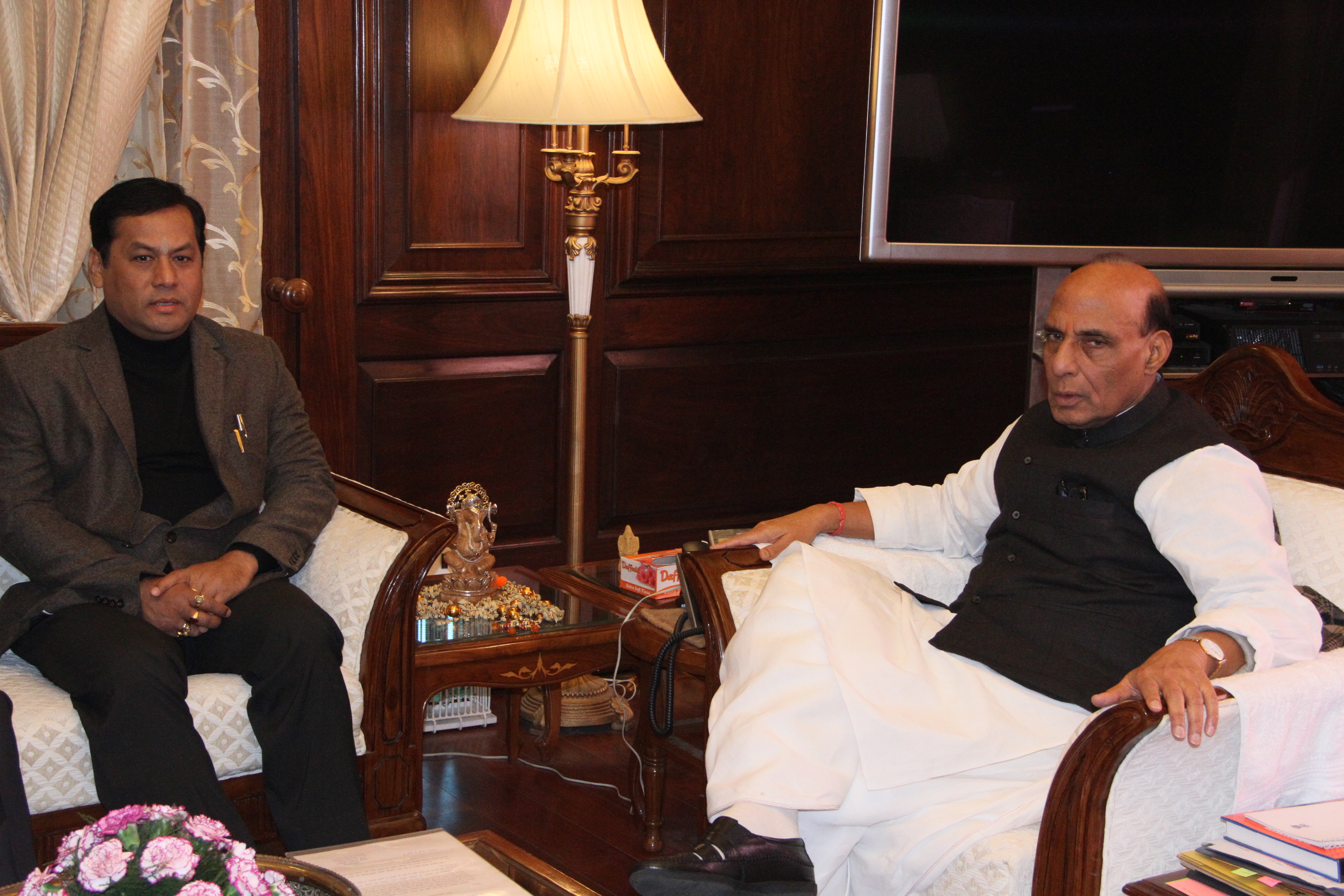 The Union Home Minister, Shri Rajnath Singh discussed the relief and rehabilitation work in the violence hit districts of Sonitpur and Kokrajhar in Assam with Minister of State for Youth Affairs and Sports (Independent Charge), Shri Sarbananda Sonowal and the Minister of State for Home Affairs, Shri Kiren Rijiju, in New Delhi on December 29, 2014.