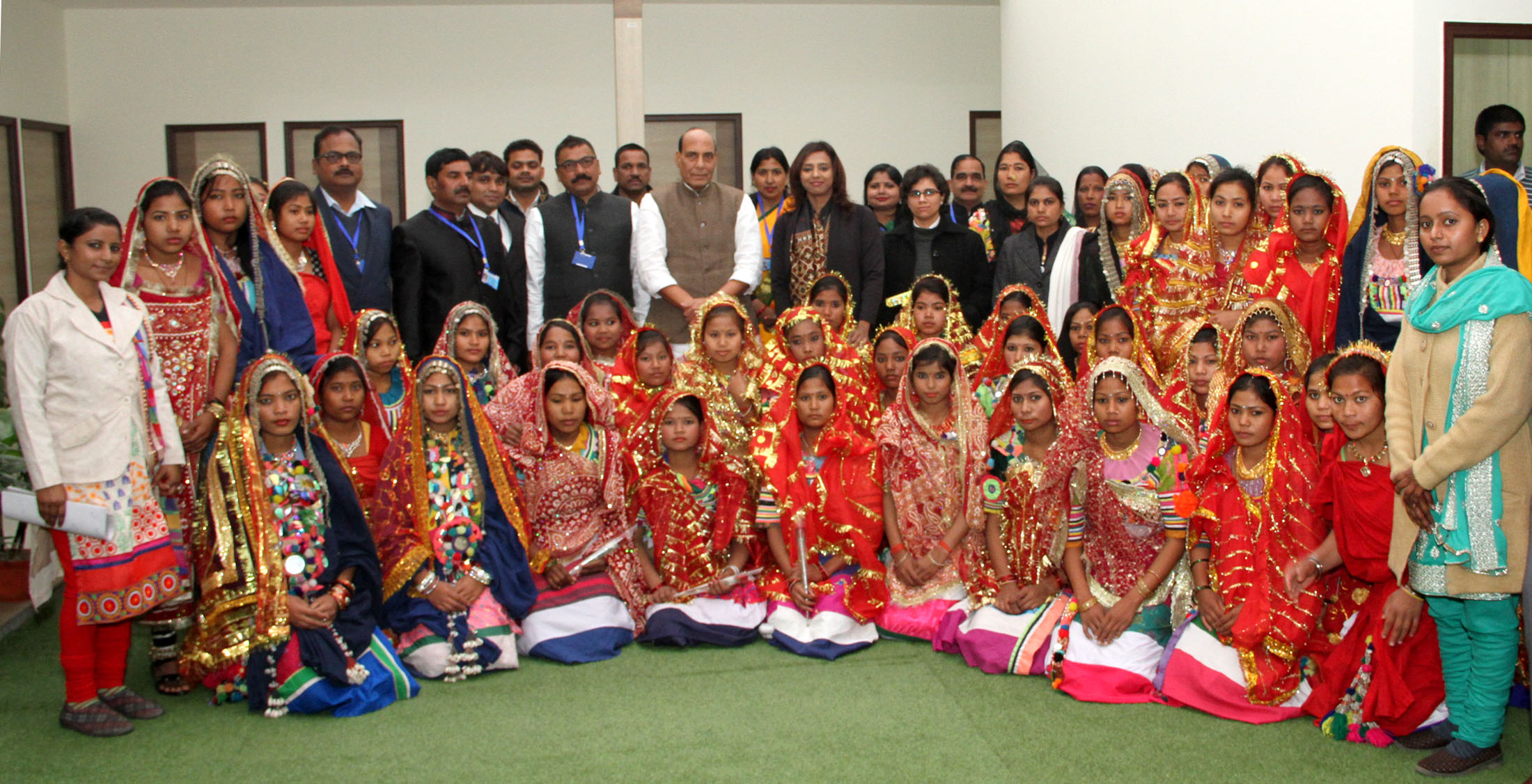 The Union Home Minister, Shri Rajnath Singh in a group photograph with the children of Tharu tribe, in New Delhi on January 20, 2016.